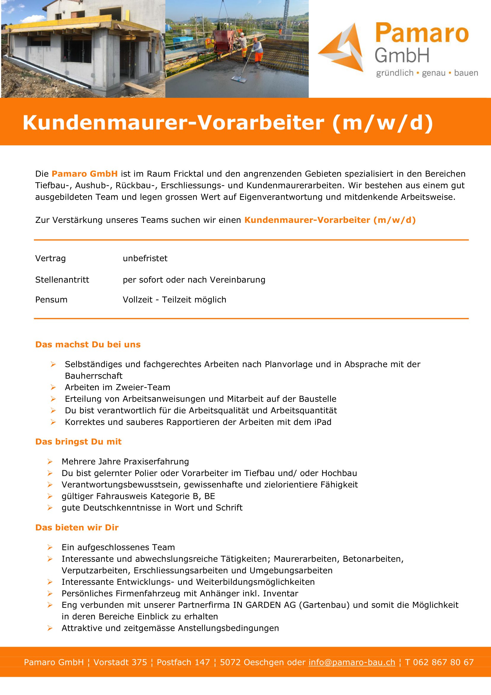 Gerne darfst Du uns Deine Bewerbung per Mail an info@pamaro-bau.ch